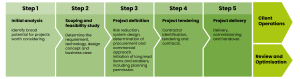 The process is similar in concept to the Royal Institute of British Architects (RIBA) process, but we have adapted it to suit energy systems projects on complex sites. It is illustrated below: